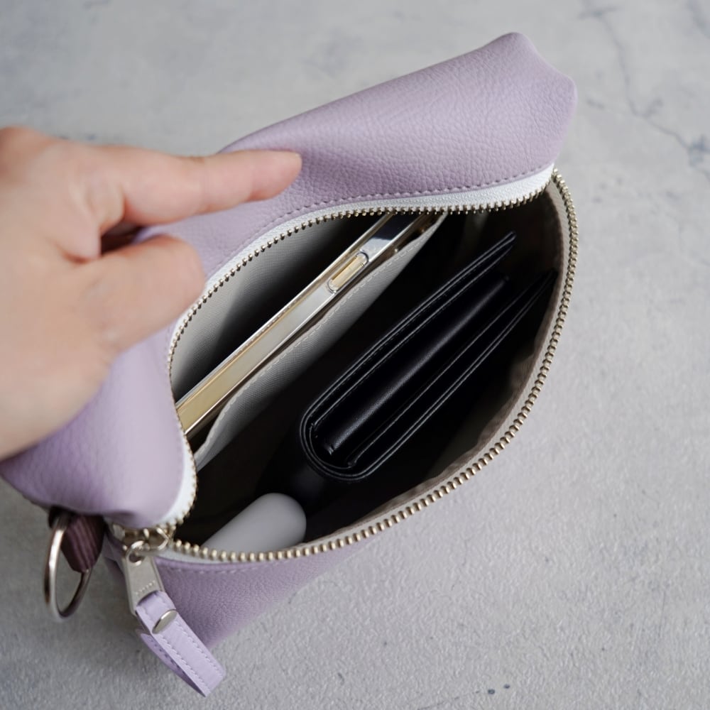 ■ 使いやすさを追求したディテール設計。ファスナーの持ち手には本体と同じカラーの合皮ストラップをつけて開け閉めもスムーズ。背面にはスマートフォンやICカードなどを収納できる外ポケット有り。