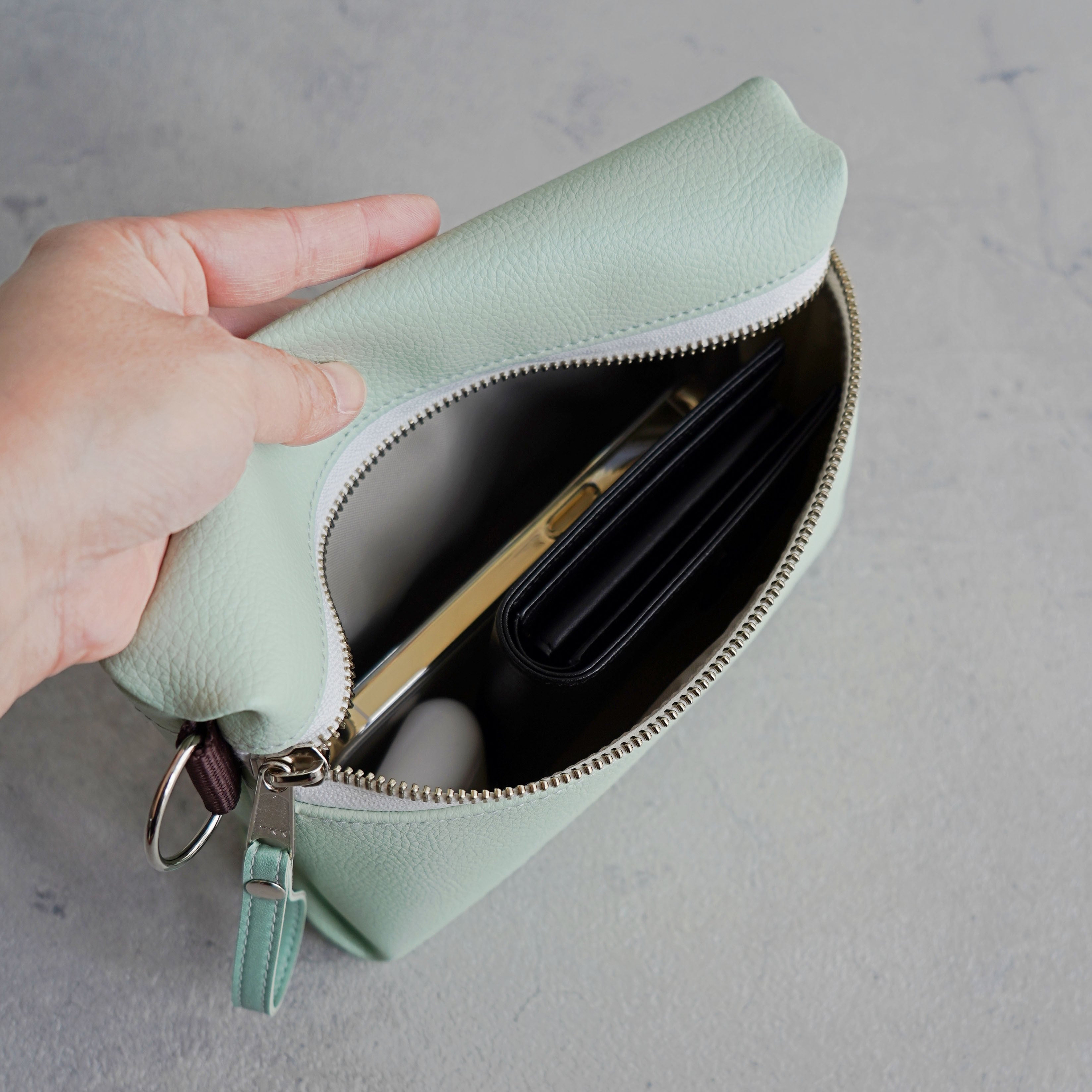 ■ 使いやすさを追求したディテール設計。ファスナーの持ち手には本体と同じカラーの合皮ストラップをつけて開け閉めもスムーズ。背面にはスマートフォンやICカードなどを収納できる外ポケット有り。