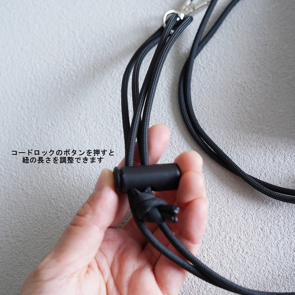 小さい方のナスカンで(4枚目写真を参照)スマホケースの穴に取り付けられるようなサイズのナスカンを使用。スマホケース用のストラップの場合、ぶら下げた時、スマートフォンを持ち上げた時の長さが丁度いいくらいの長さになるように設計しました。長さがないと、スムーズにスマートフォンを持ち上げる事ができないため、一番伸ばした状態で140cm、短くした状態で115cmの長さ設定にしています。