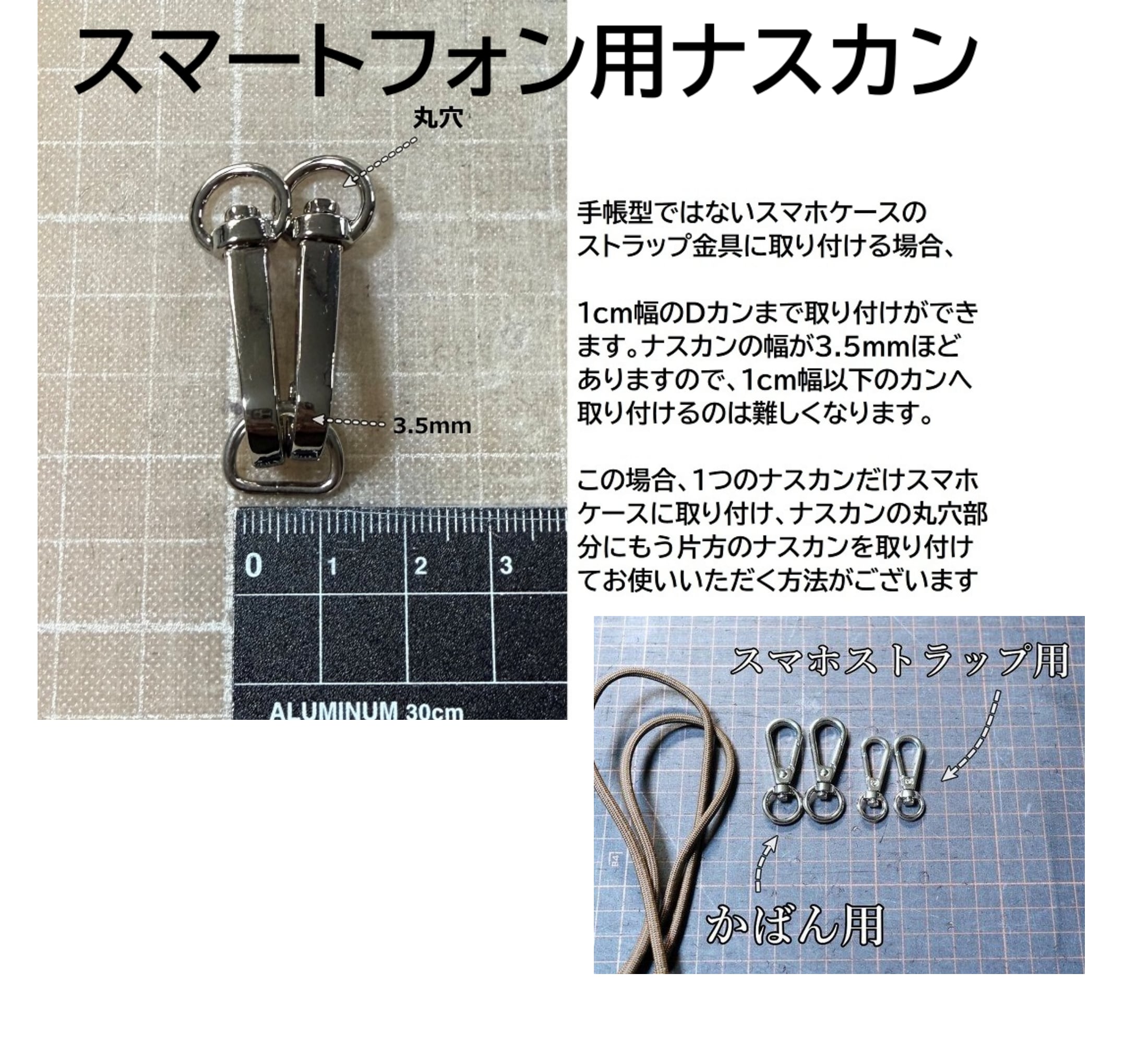 ナスカンのサイズが大きくなり、ストラップの紐が短くなります。ナスカンが大きくなることで、カバンの重みへの耐久性を上げました。スマホ用だと紐が長すぎてしまうため、バッグ用では一番短くしたときに95cmになるように作成しています。